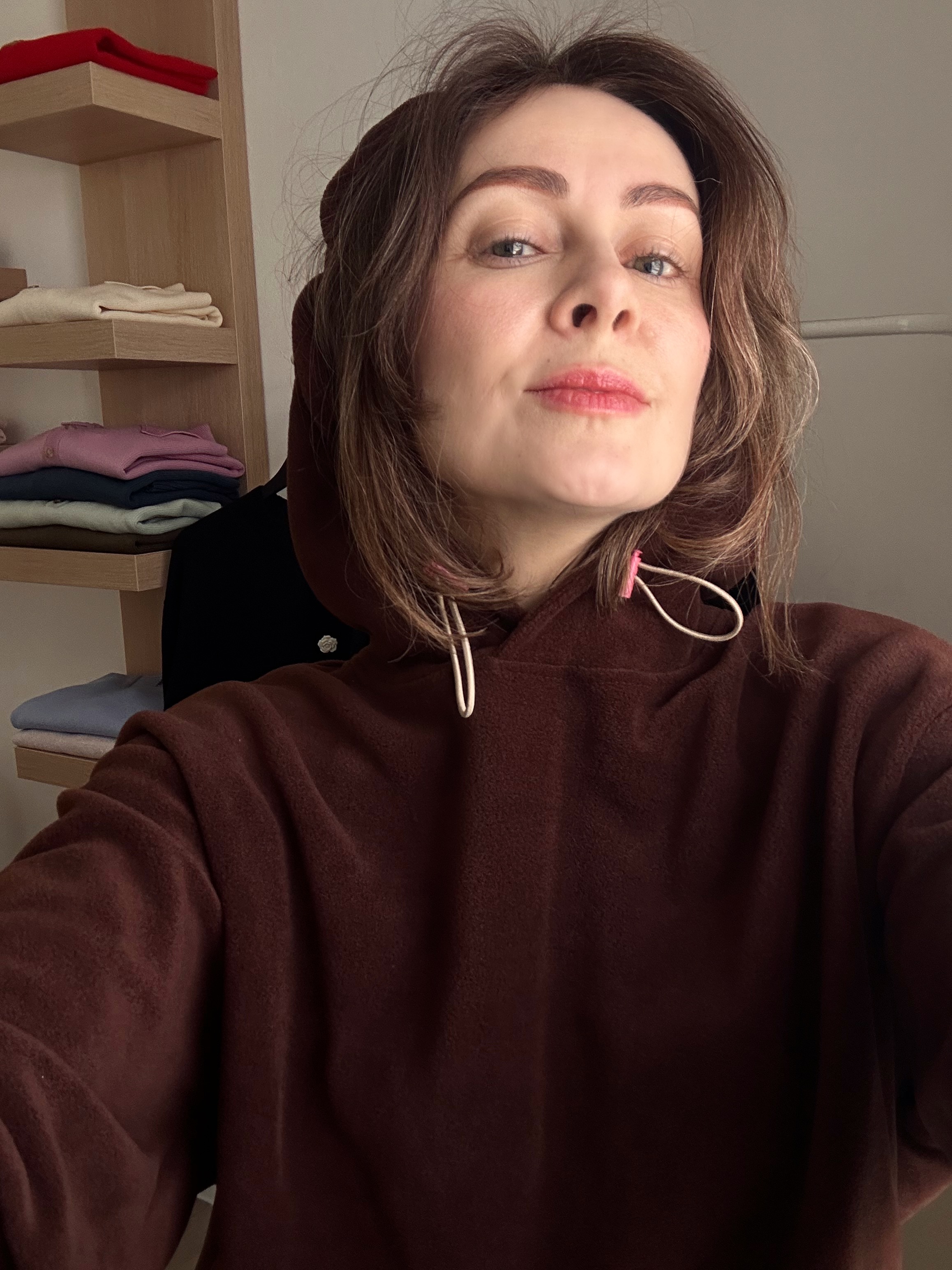 Костюм женский из флиса наивысшего качества.Толстовка укороченная с капюшоном на поясе резинке. Свободного кроя, спущенное плечо. Двойной капюшон с бежевым шнуром-резинкой и розовыми фиксаторами, чтобы регулировать свободу капюшона. Красивый акцент костюма.