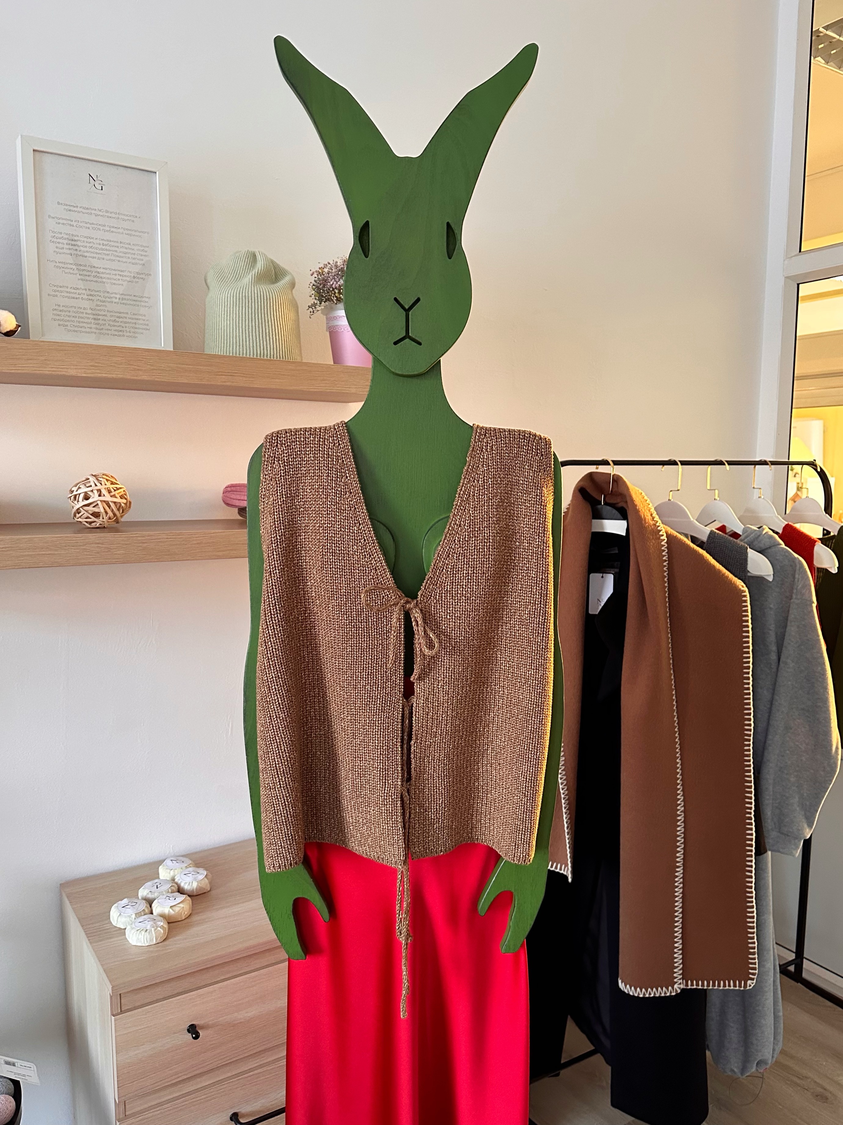 Длина изделия 54-55 см, обхват по линии груди по изделию 110 см.